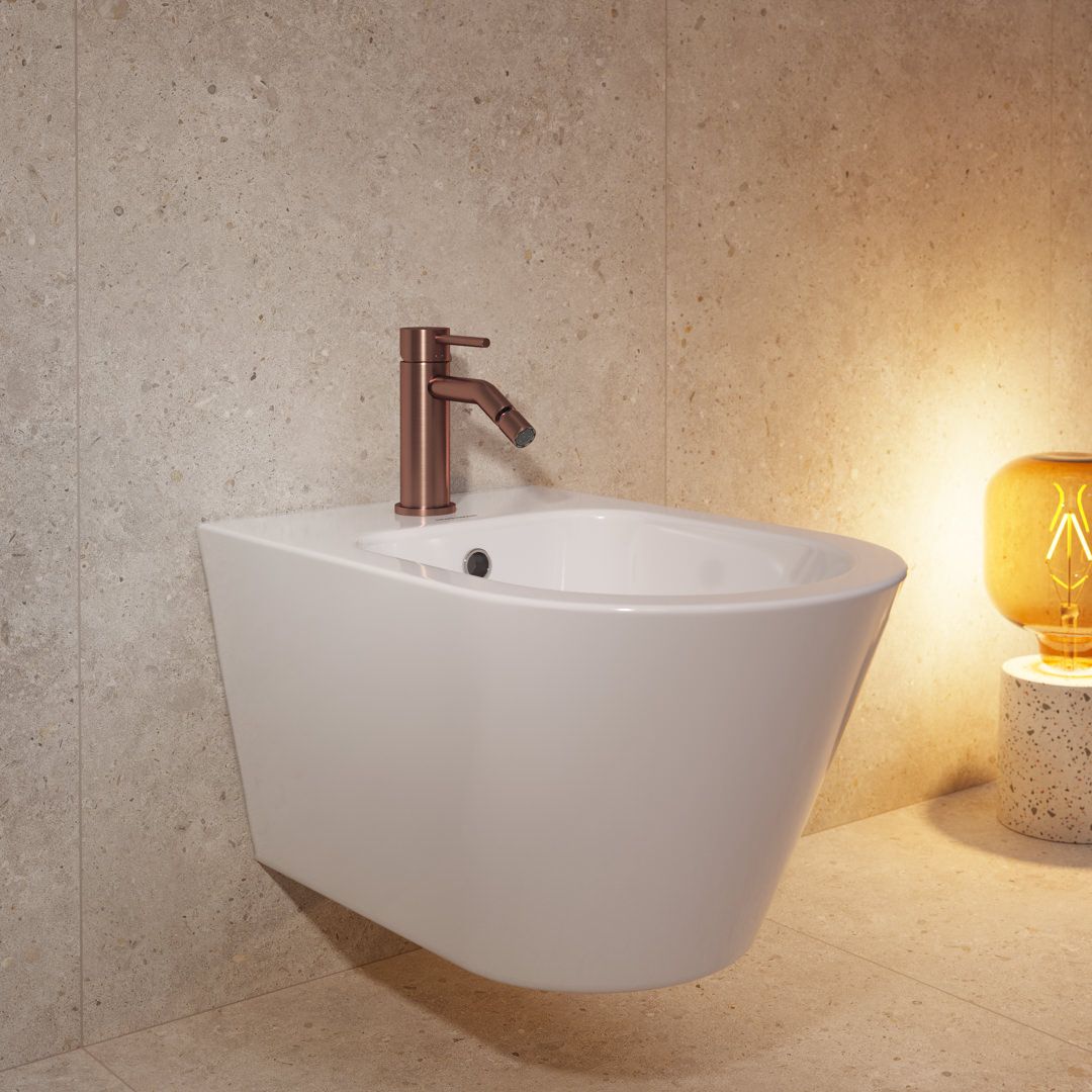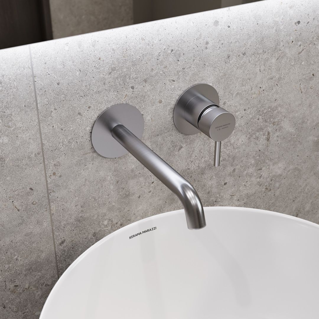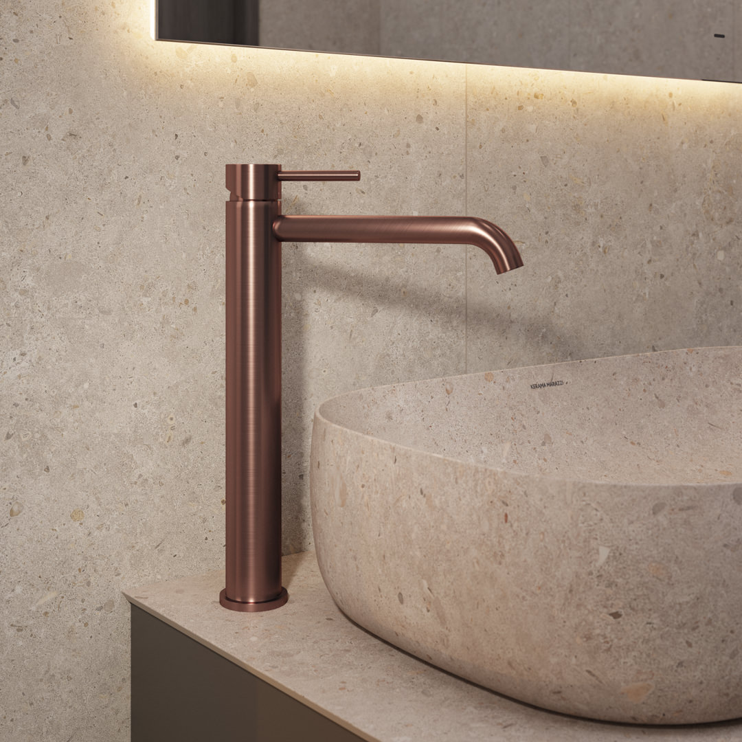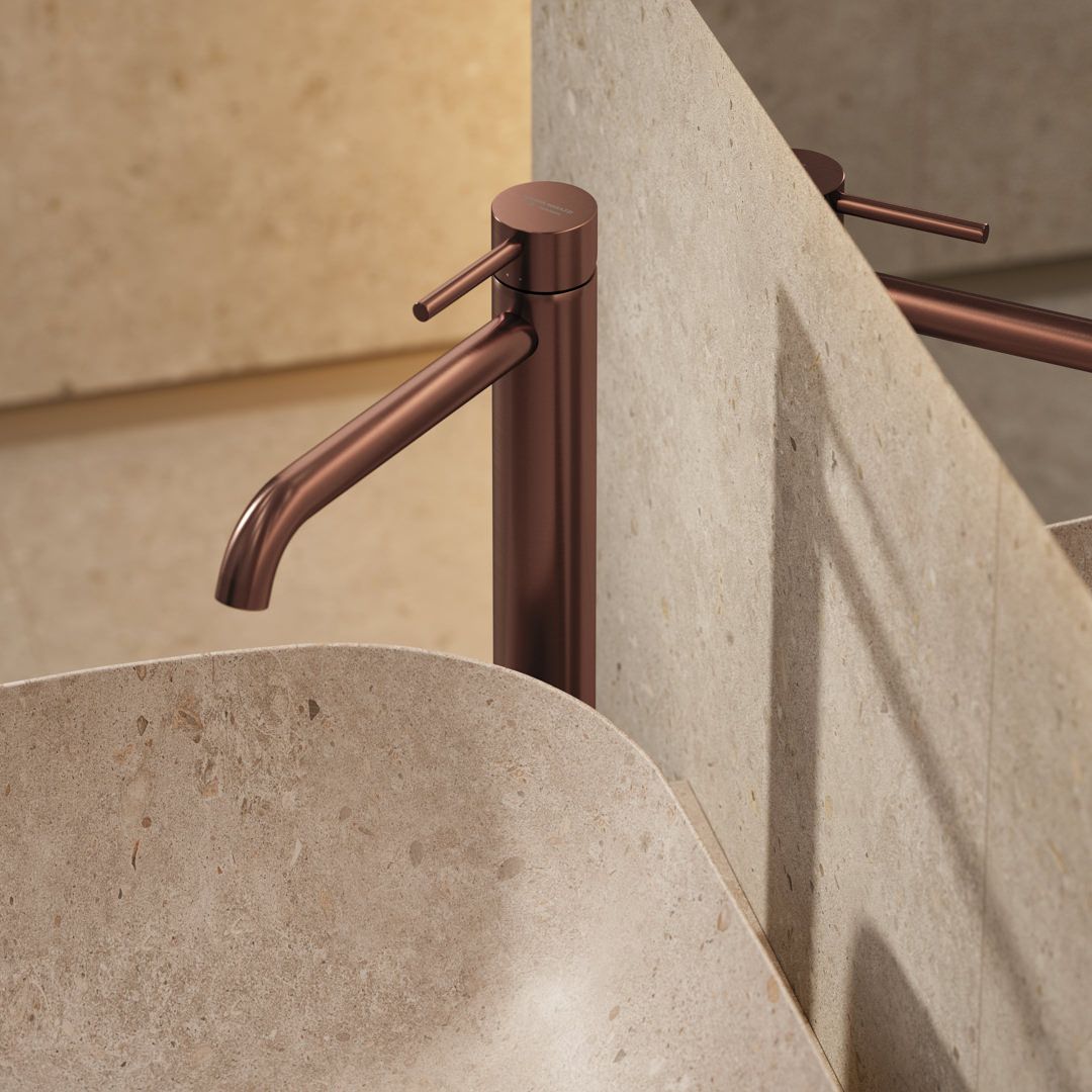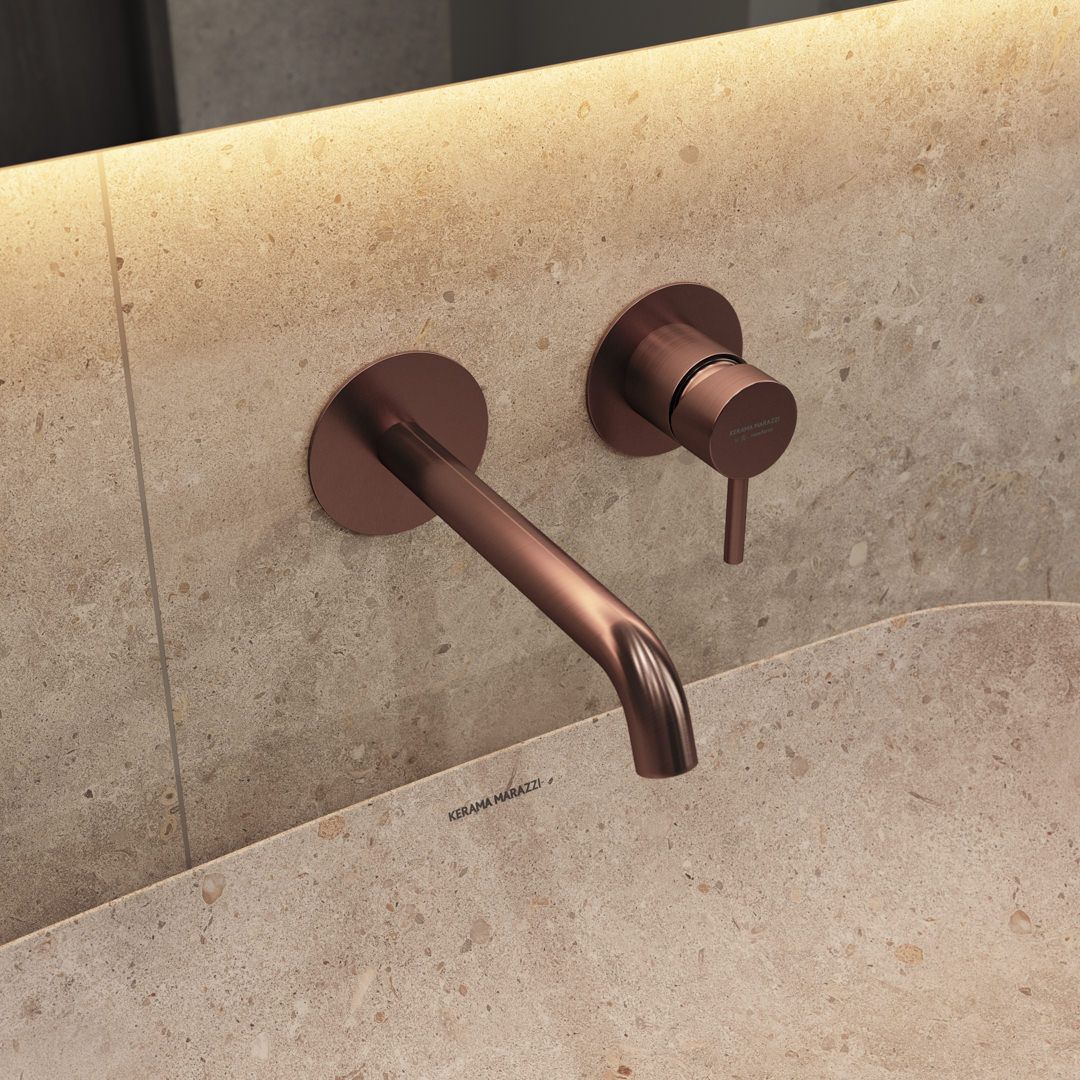Благородная палитра Этерна — нержавеющая сталь и брашированная медь, которая наносится на изделия по технологии вакуумного напыления. В каждом из двух цветов предложены смесители для установки на стену, раковину, столешницу и биде, а также имеется душевой комплект скрытого монтажа.