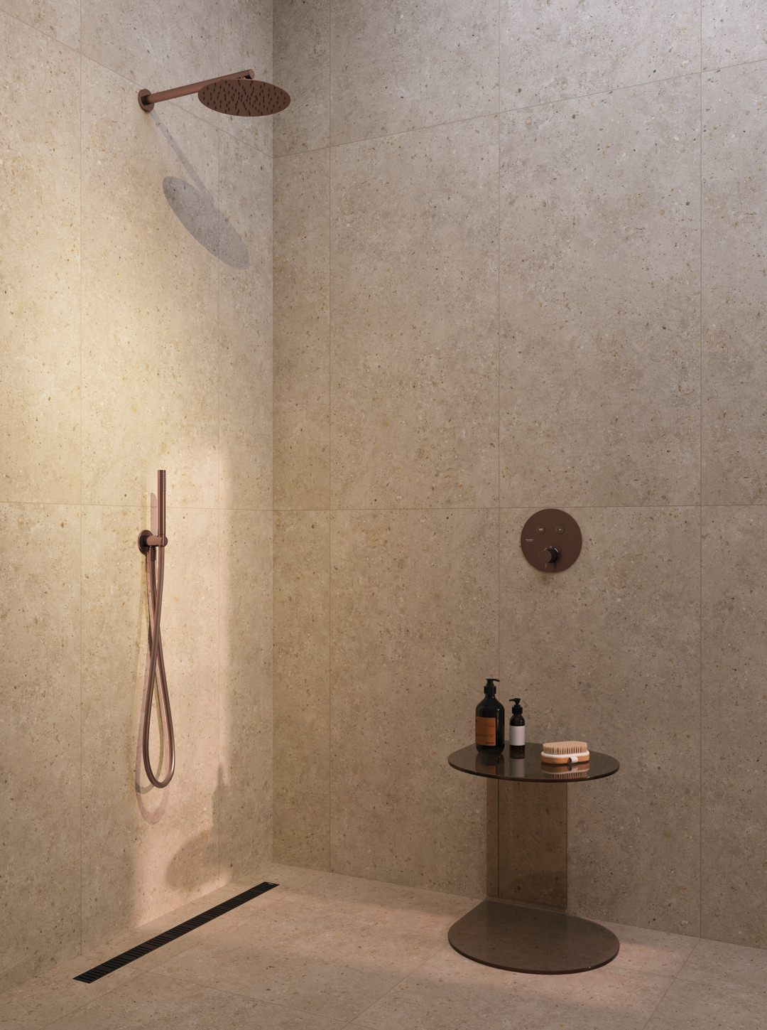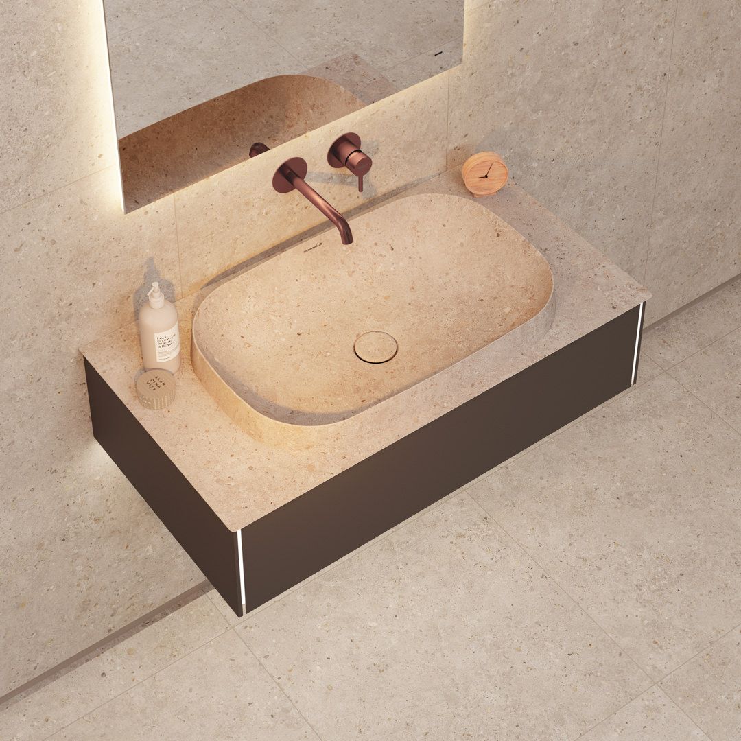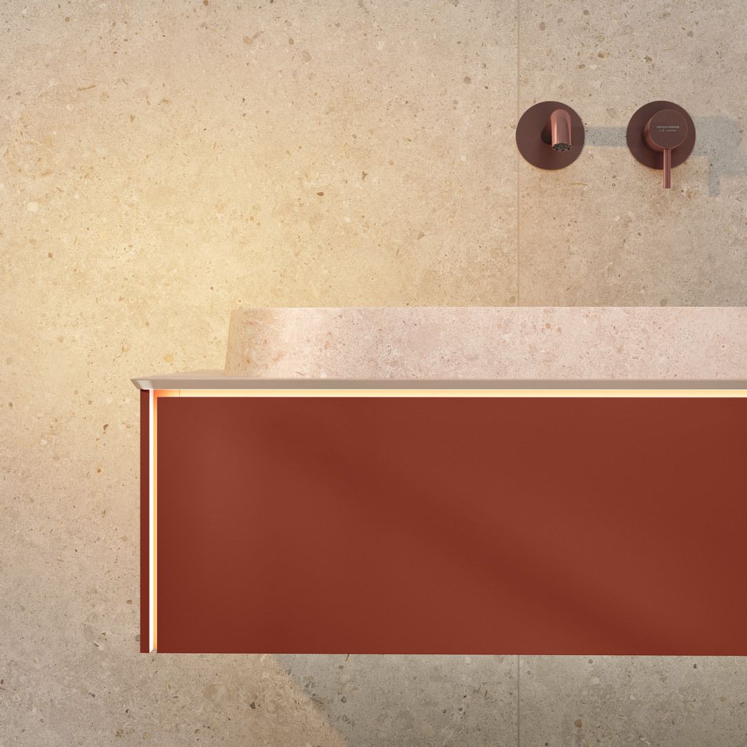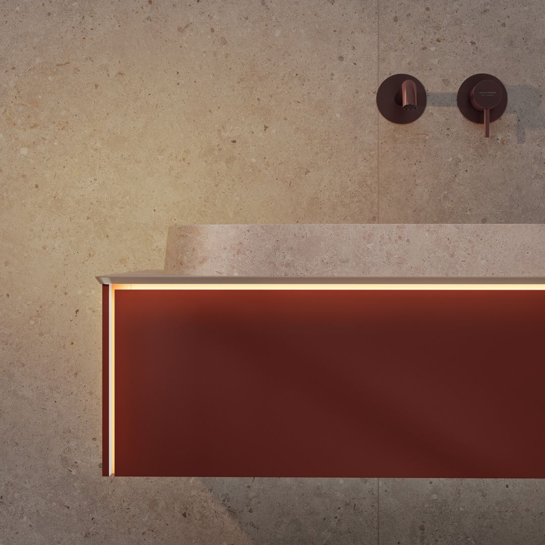 Благородная палитра Этерна — нержавеющая сталь и брашированная медь, которая наносится на изделия по технологии вакуумного напыления. В каждом из двух цветов предложены смесители для установки на стену, раковину, столешницу и биде, а также имеется душевой комплект скрытого монтажа.
