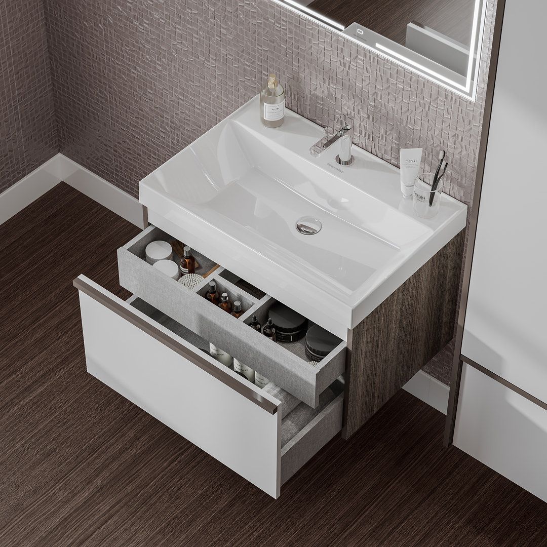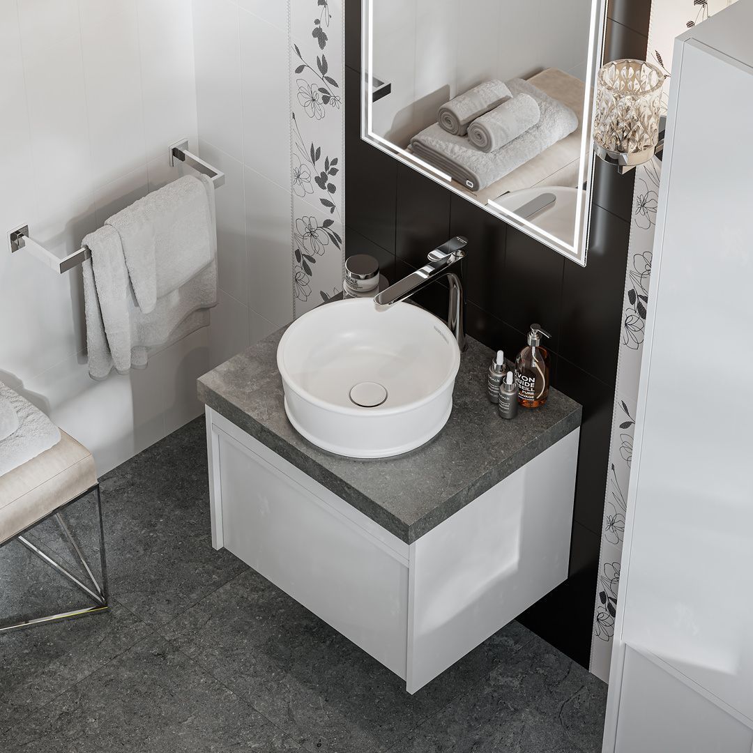 Выбирайте размер, форму и цвет раковины, размер тумбы Модула и рисунок столешницы из керамического гранита для создания одного из сотен возможных решений!