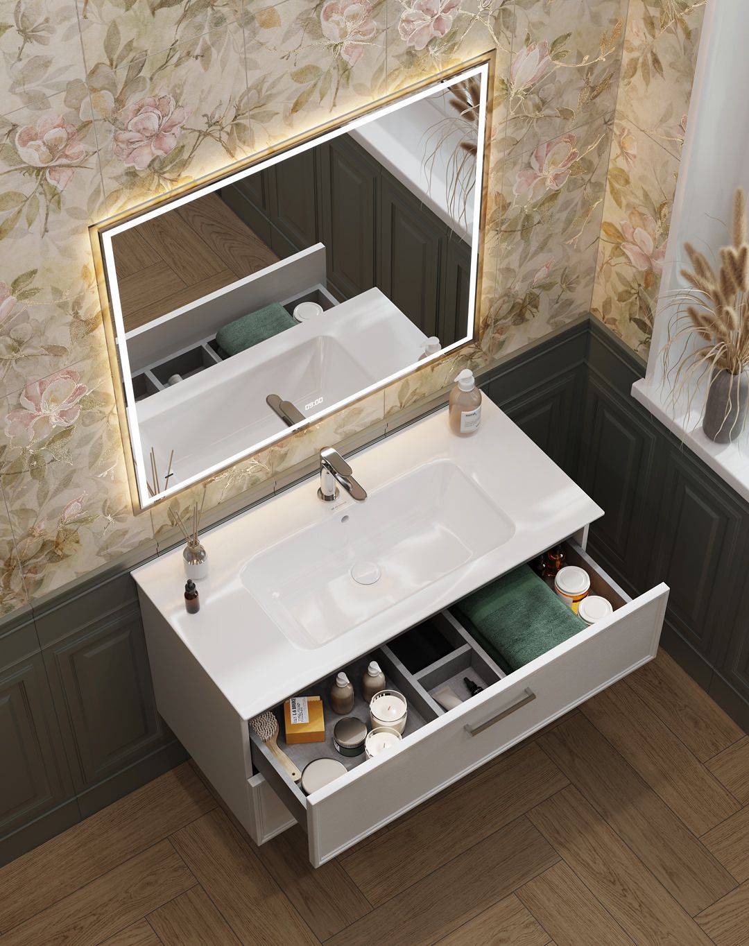 Линейка подвесных тумб «Пиано Классик» позволяет использовать раковины Пиано в интерьере традиционной ванной комнаты. Тонкая неоклассическая рамка на фасаде придаёт мебели особую элегантность и хорошо сочетается с уточнённой эстетикой раковин.